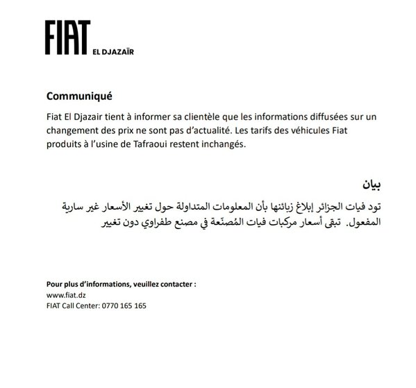 Fiat Eldjazair a démenti mercredi soir les informations faisant état de la hausse des tarifs de Doblo dans ces deux versions: tôlée et ludospace.