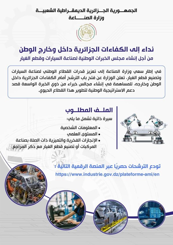 Les compétences algériennes intéressées sont invitées à soumettre leurs candidatures en ligne via le lien https://www.industrie.gov.dz/plateforme-ami/en/.