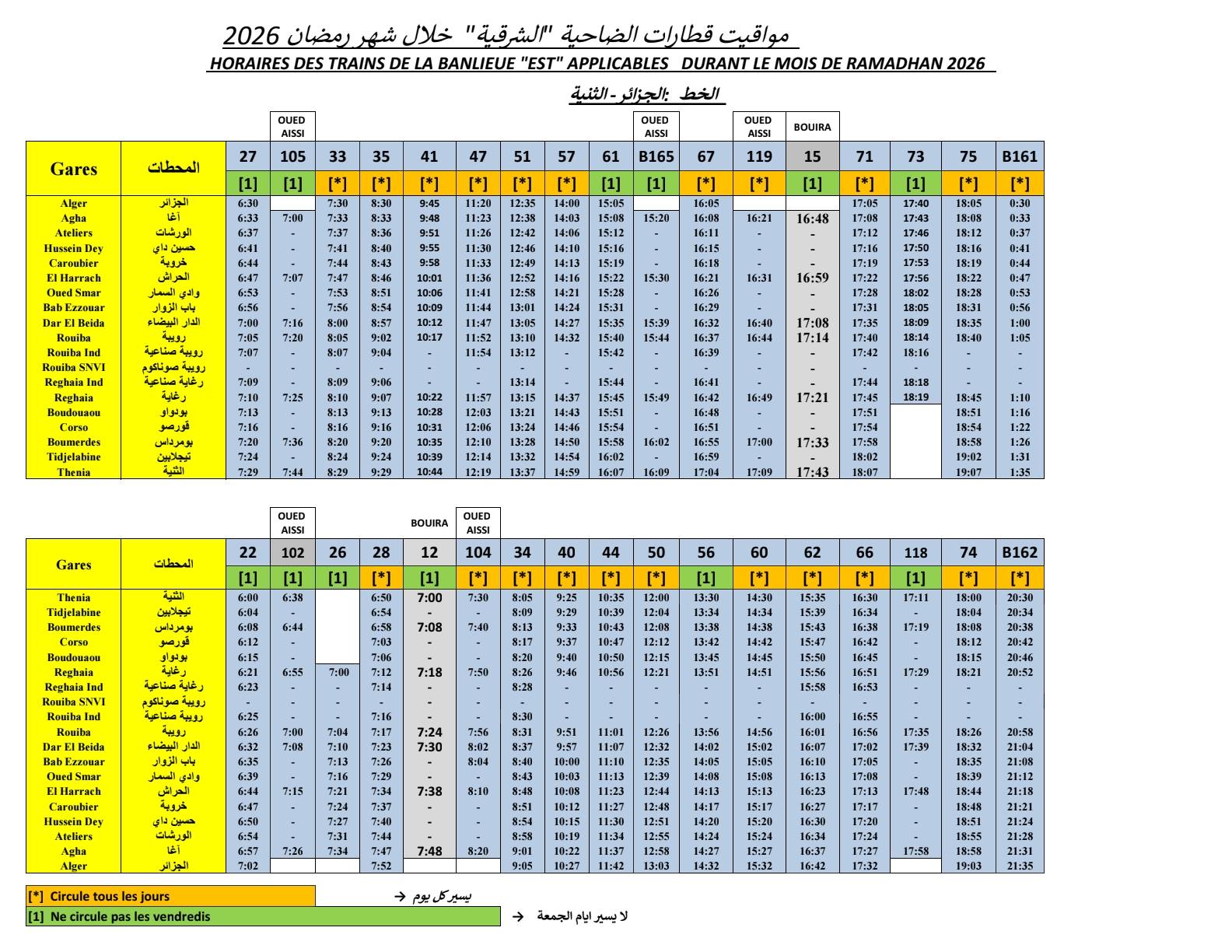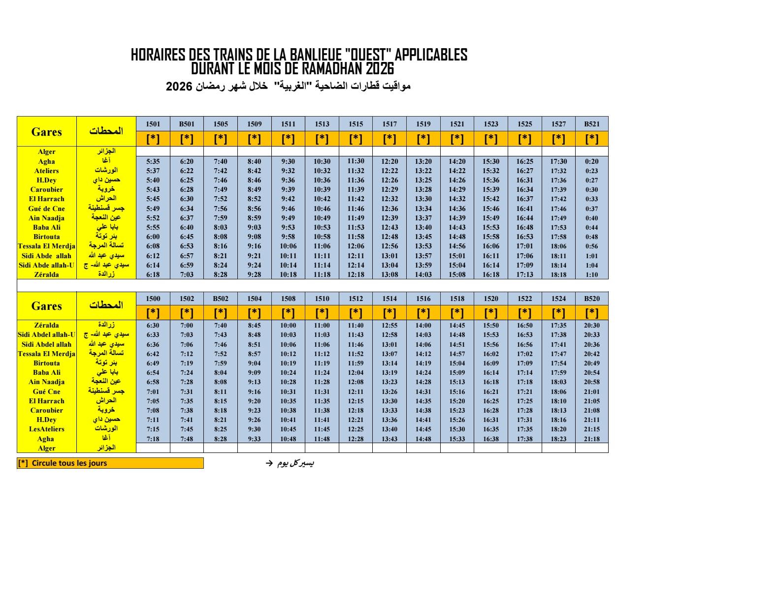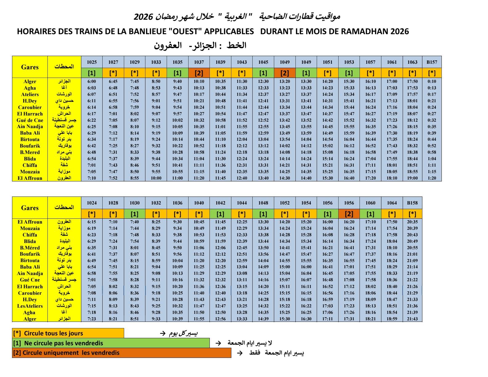 La Société nationale de transport ferroviaire (SNTF) a publié les nouveaux horaires de circulation des trains de la banlieue d’Alger pour le mois de Ramdan.