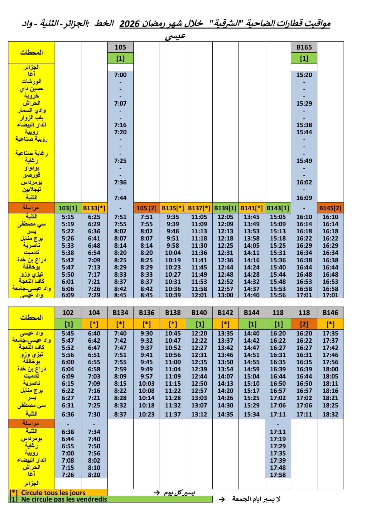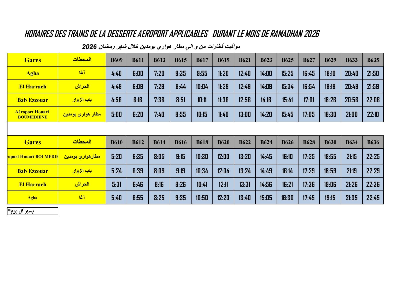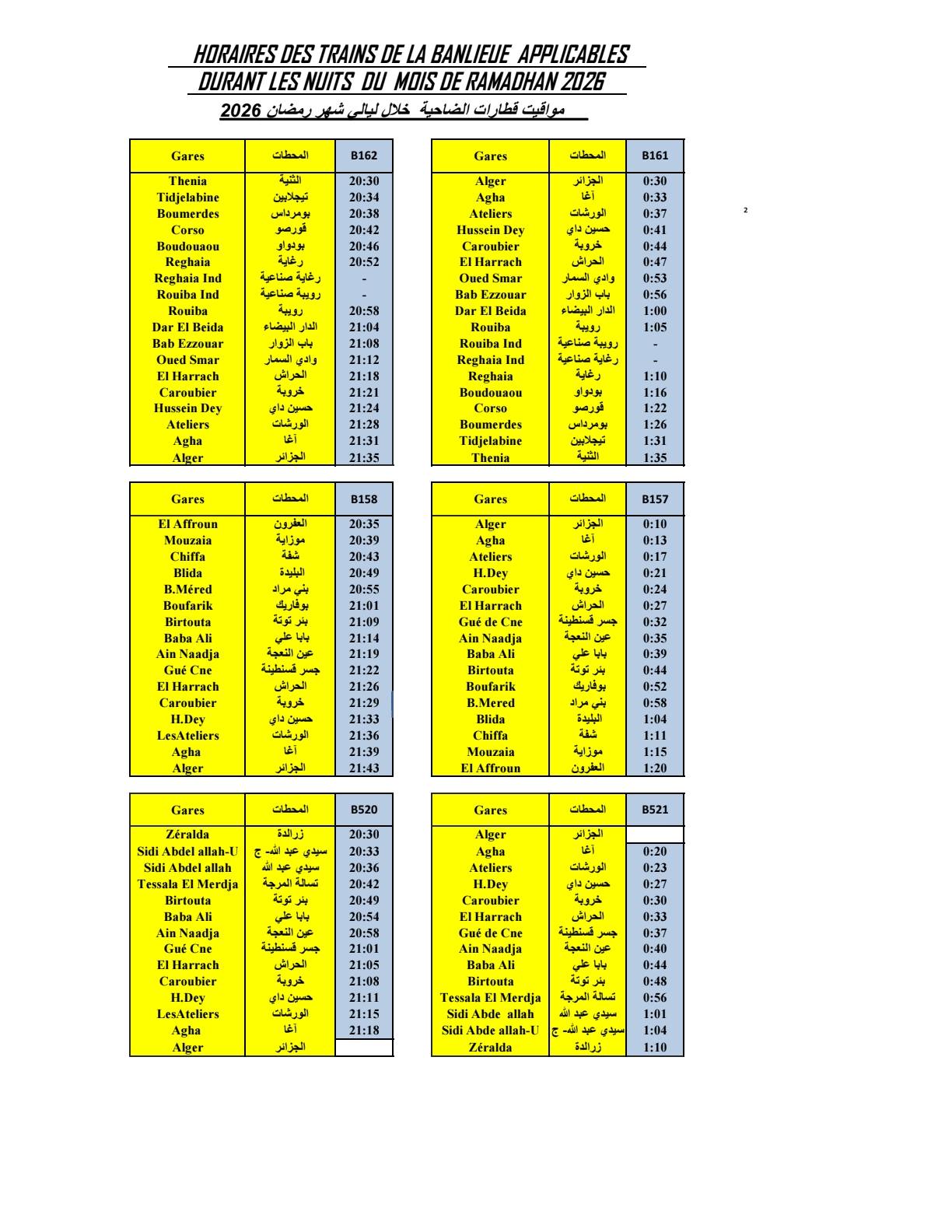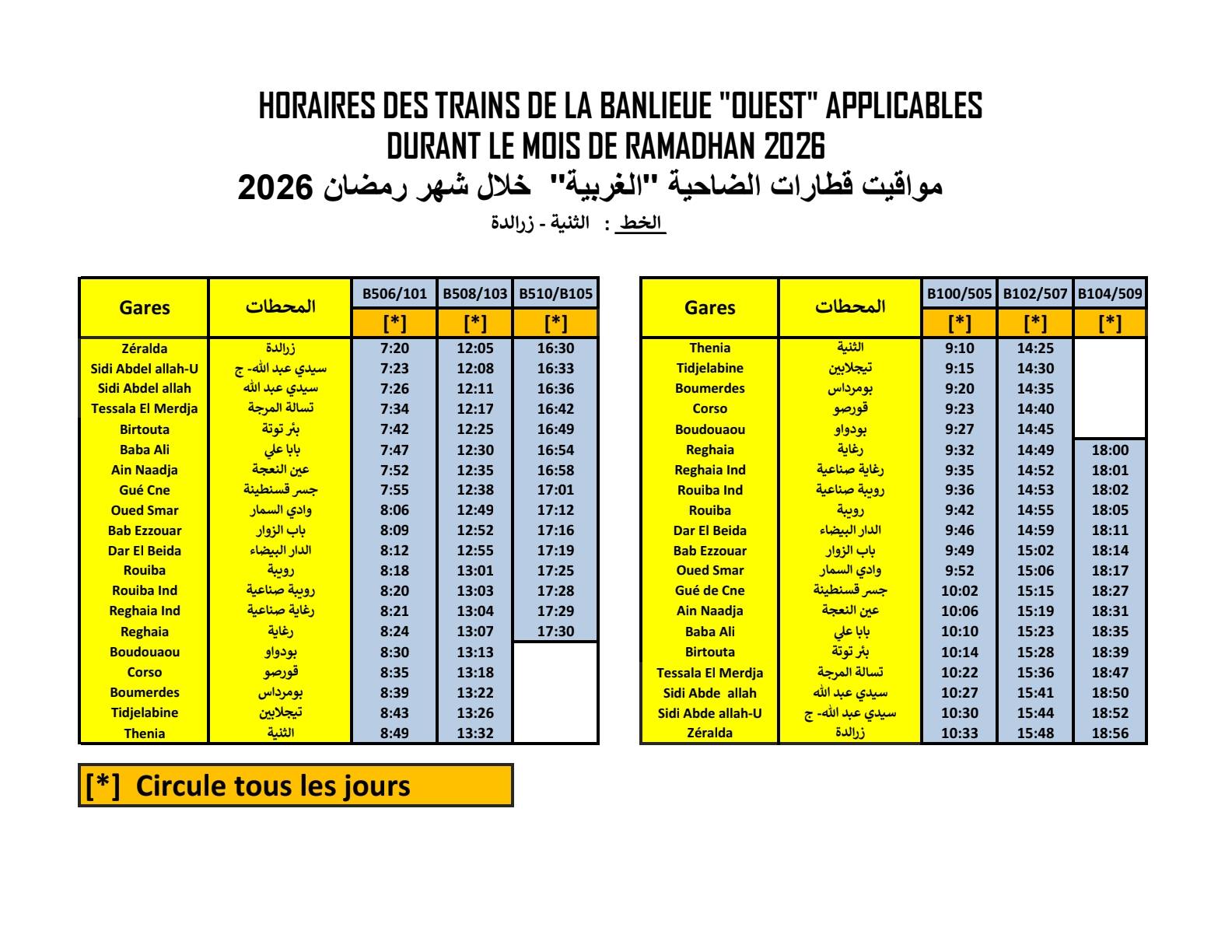 La Société nationale de transport ferroviaire (SNTF) a publié les nouveaux horaires de circulation des trains de la banlieue d’Alger pour le mois de Ramdan.