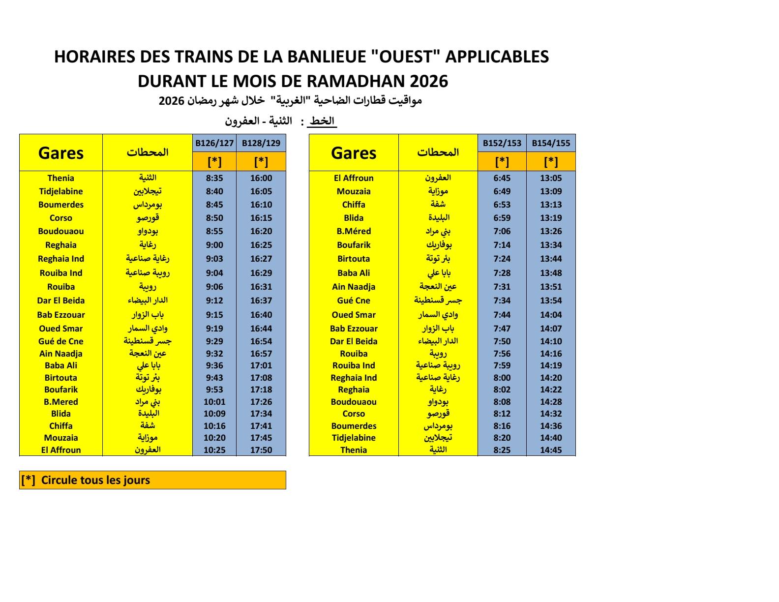 Les nouveaux horaires des trains de banlieue durant Ramdan